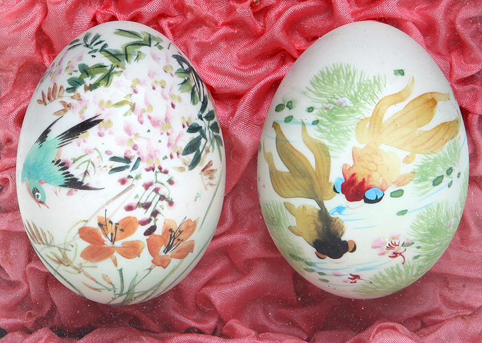 Пара пасхальных яиц в прозрачной шкатулке. Натуральное куриное яйцо полое внутри, ручная роспись. Китай, вторая половина ХХ века