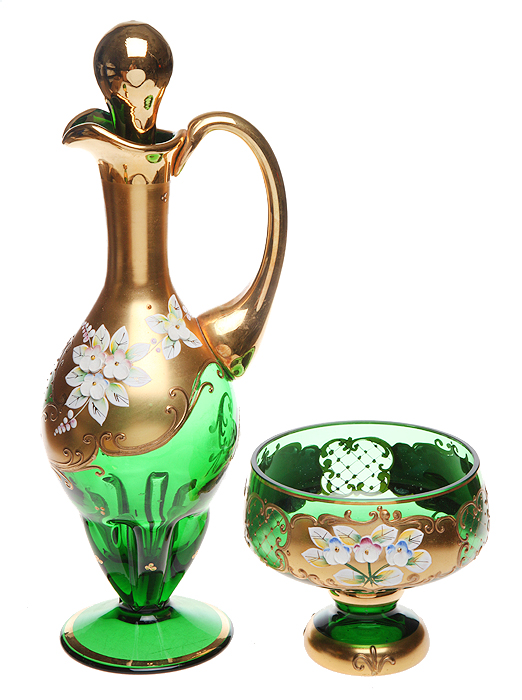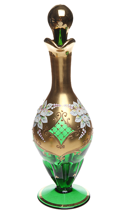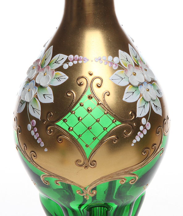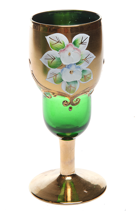 Богемское стекло изумрудного цвета, цветные эмали, золочение, ручная работа.