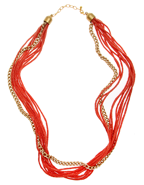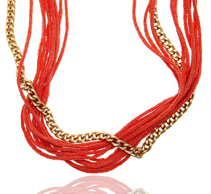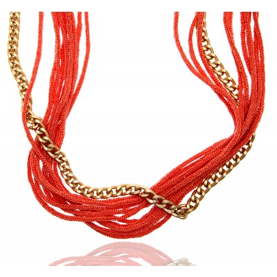 Ожерелье "Коралловые нити". Синтетический шнур кораллового цвета, бижутерный сплав золотого тона. Гонконг, 2000-е гг.