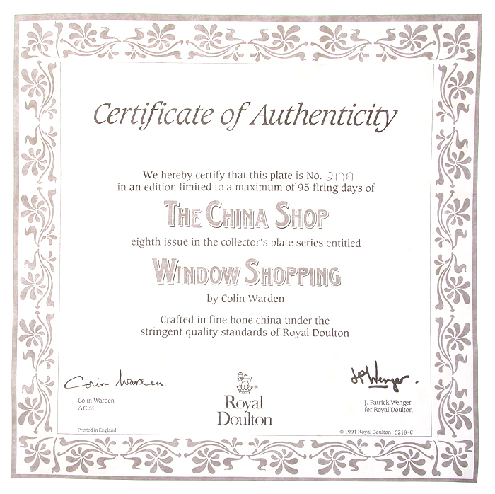 Колин Уорден "Посудная лавка", декоративная тарелка. Фарфор, деколь. Royal Doulton, Великобритания, 1991 год