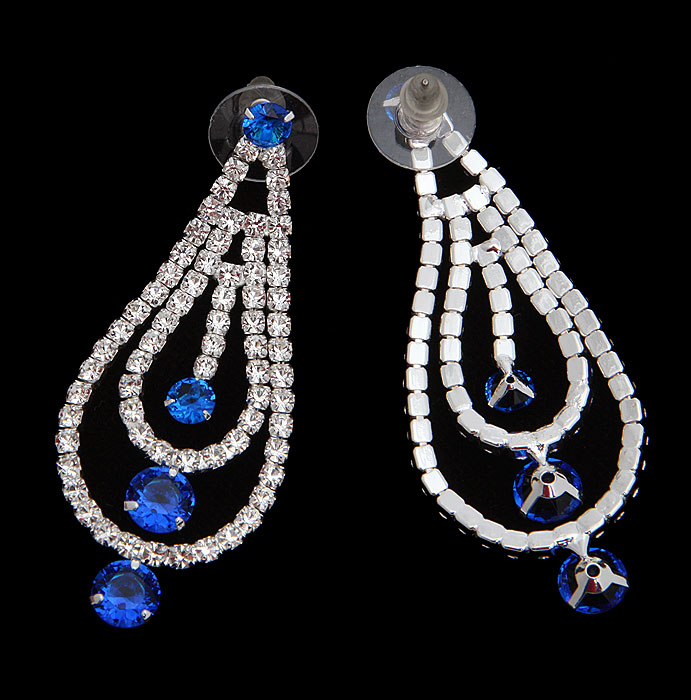Австрийские кристаллы сапфирового цвета, прозрачные стразы, бижутерный сплав серебряного тона.