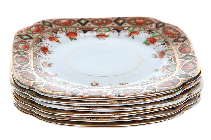 Набор десертных тарелок, 6 шт. Фарфор, деколь, роспись, золочение. Roslyn, Великобритания, первая половина ХХ века