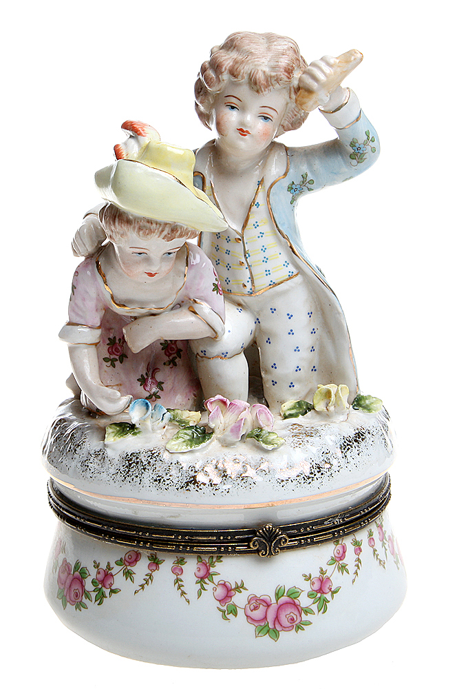Музыкальная шкатулка "Дети рвут цветы" в стиле Мейсен. Фарфор, роспись, золочение, ручная работа. Высота 17 см. Западная Европа, конец XX века.