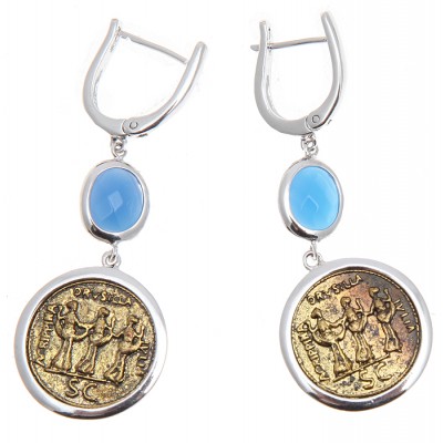Серьги "Древние монеты". Ювелирный сплав, синий агат, родиевое покрытие. Nina Ford, Испания, 2000-е гг.