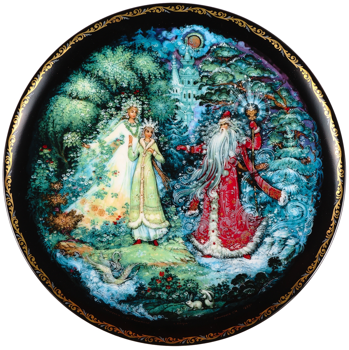 Сергей Дмитриев "Снегурочка и ее родители", коллекционная декоративная тарелка. Фарфор, роспись, золочение. Холуйская миниатюра, Россия, 1991 год