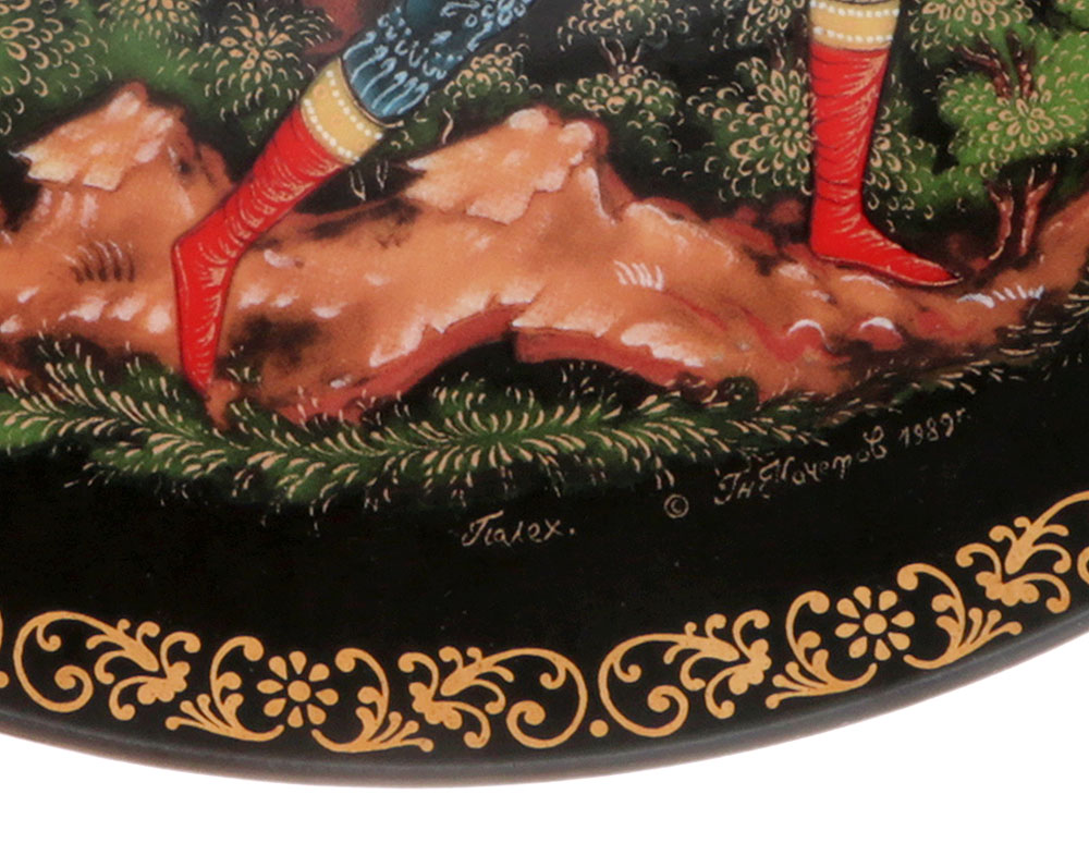 Маркировка: надглазурное клеймо черногоо цвета "Палех" и аннотация.