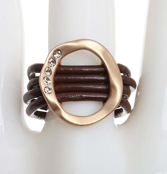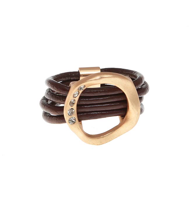 Кольцо коктейльное "Фортуна". Натуральная кожа коричневого цвета, прозрачные стразы, гипоаллергенный бижутерный сплав золотого тона. Krikos, Испания
