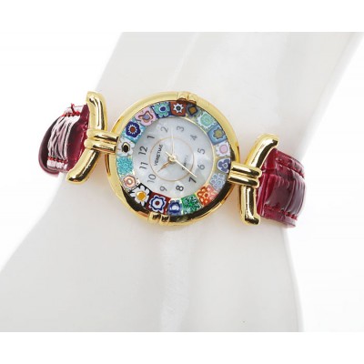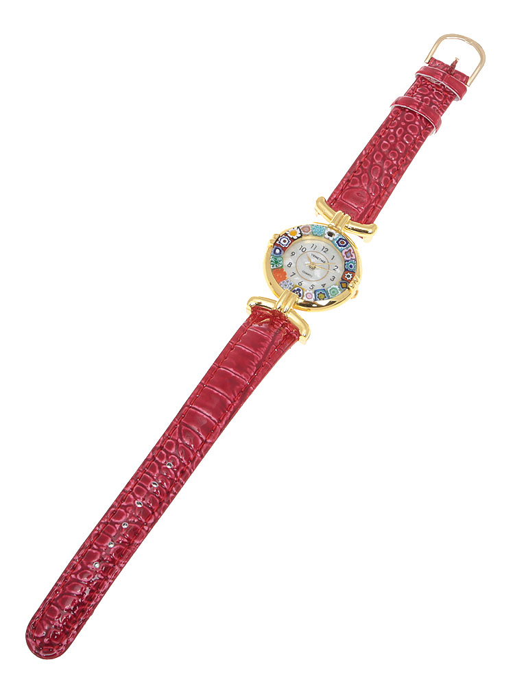 Часы женские наручные. Муранское стекло, искусственная кожа красного цвета, перламутр, металл золотого тона. Murano, Италия (Венеция)