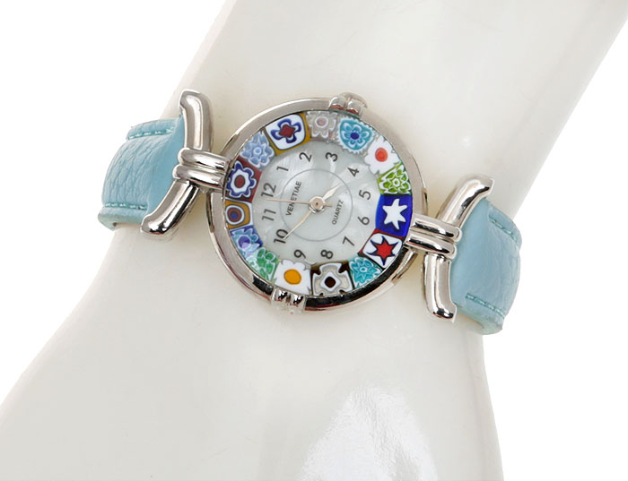 Часы женские наручные. Муранское стекло, искусственная кожа голубого цвета, перламутр, металл серебряного тона. Murano, Италия (Венеция)