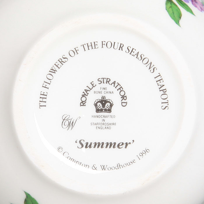 На дне издения черное подглазурное клеймо Royal Stratford "Fine bone china (высококачественный костяной фарфор). Handcrafted in Staffordshire. England", название чайника и серии.