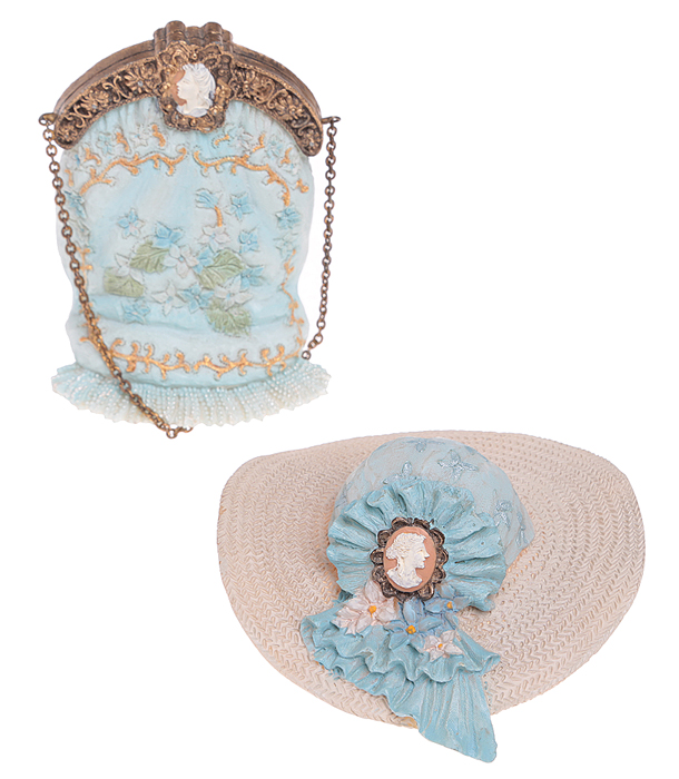 Набор миниатюр из 3 предметов в стиле рококо: шляпка, сумочка, башмачок.