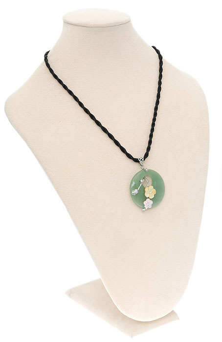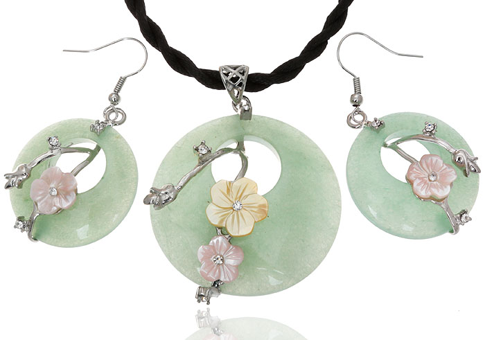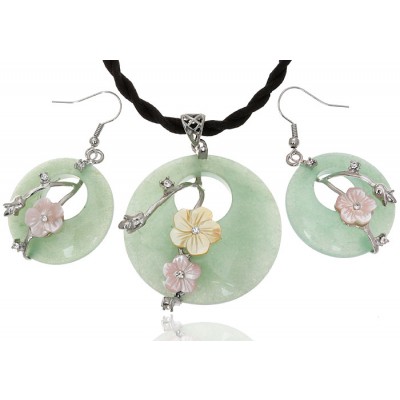 Комплект "Цветущая сакура": кулон на шнурке и серьги. Натуральный нефрит, перламутр, стразы, бижутерный сплав серебряного тона. Гонконг