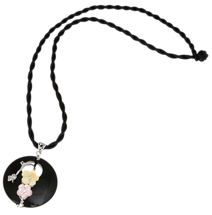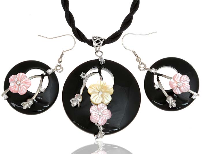 Комплект "Цветущая сакура": кулон на шнурке и серьги. Натуральный агат, перламутр, стразы, бижутерный сплав серебряного тона. Гонконг