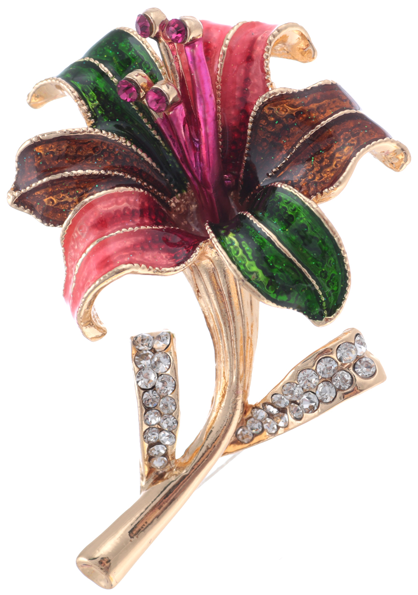 Брошь "Роскошная лилия" от Arrina. Цветные эмали, прозрачные стразы, бижутерный сплав золотого тона. Гонконг