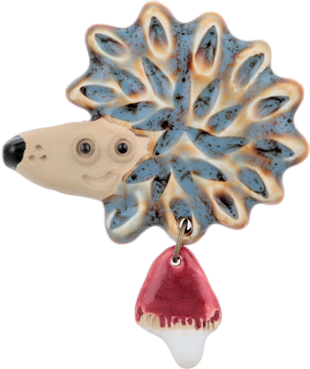 Брошь "Ежик с грибочком", ручная авторская работа. Керамика, роспись, глазуровка. Россия
