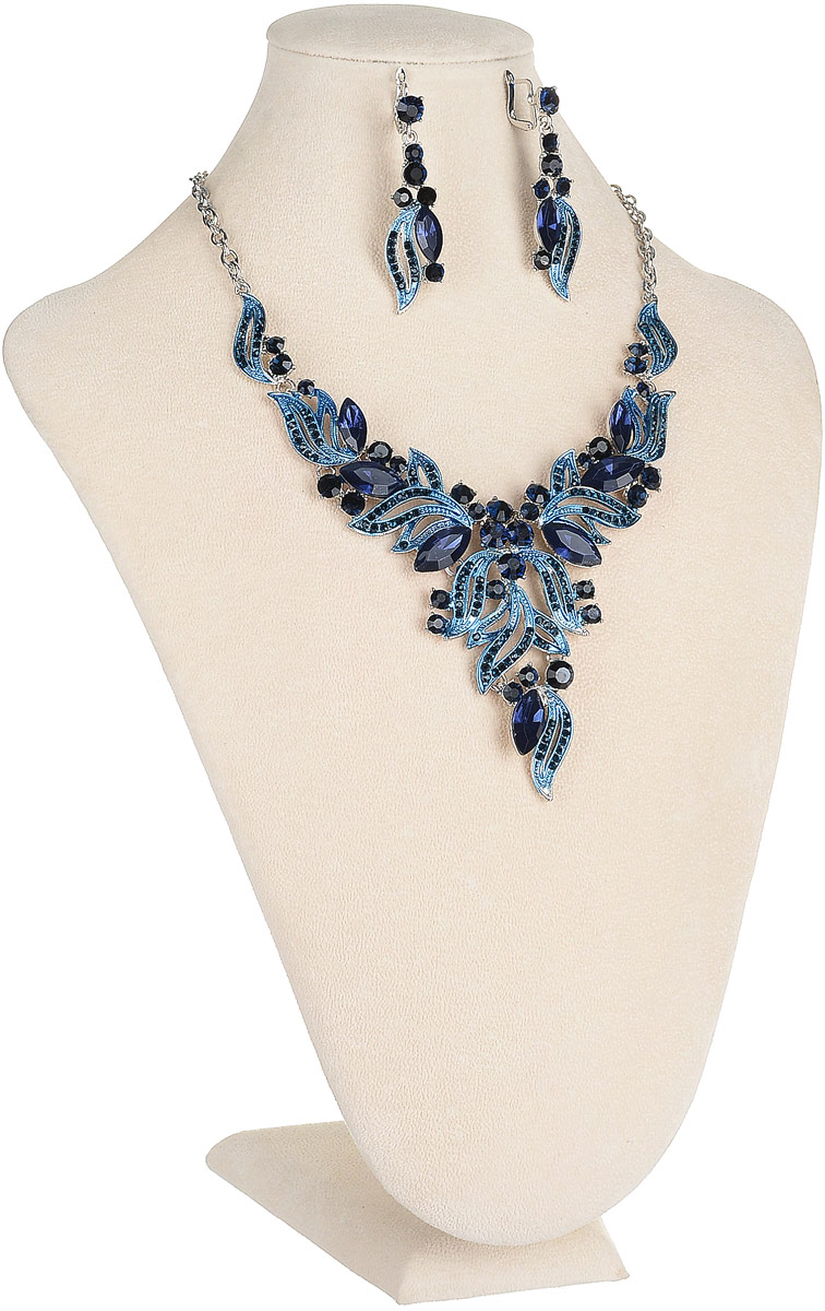 Комплект "Флавия": ожерелье и серьги от Arrina. Кисталлы и стразы сапфирового цвета, бижутерный сплав серебряного тона. Гонконг