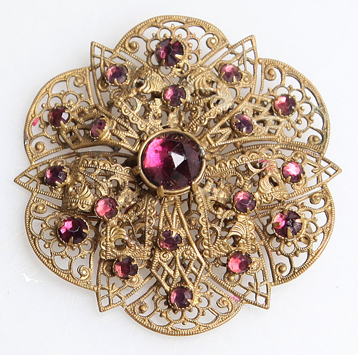 Брошь "Виктория", филигрань, стразы, бижутерный сплав "старое золото". Великобритания, 1920-е гг.