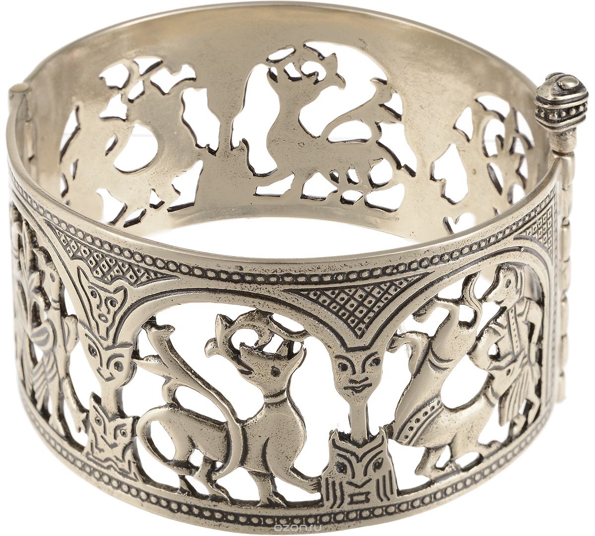 Створчатый браслет «Макоши» широк и массивен. В одной из арок, между двумя столбами - «идолами», изображен волк. Древние славяне почитали это животное, воспринимали его посредником между людьми и богами. Считается, что волк приносит удачу. В другой арке помещена длинноногая птица, в которой легко узнать журавля. Прилет журавлей означал возвращение тепла. Игры и знаменитые пляски журавлей совпадали с началом праздника русалий, когда совершали обряды в честь солнца и воды. Такой браслет является символом удачи и богатства.