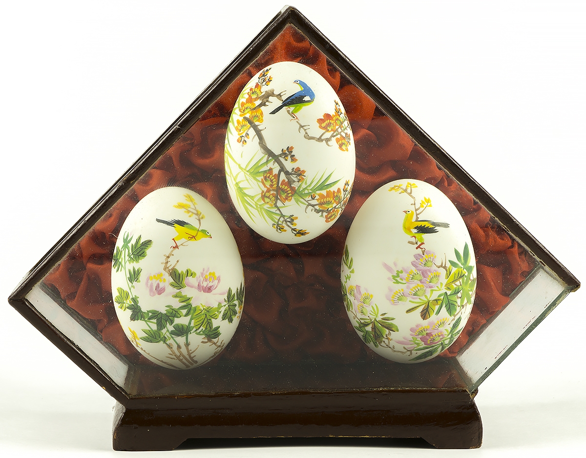 Набор пасхальных яиц в прозрачной шкатулке, 3 шт. Натуральное куриное яйцо, ручная роспись, ткань, стекло, дерево. Китай, вторая половина ХХ века