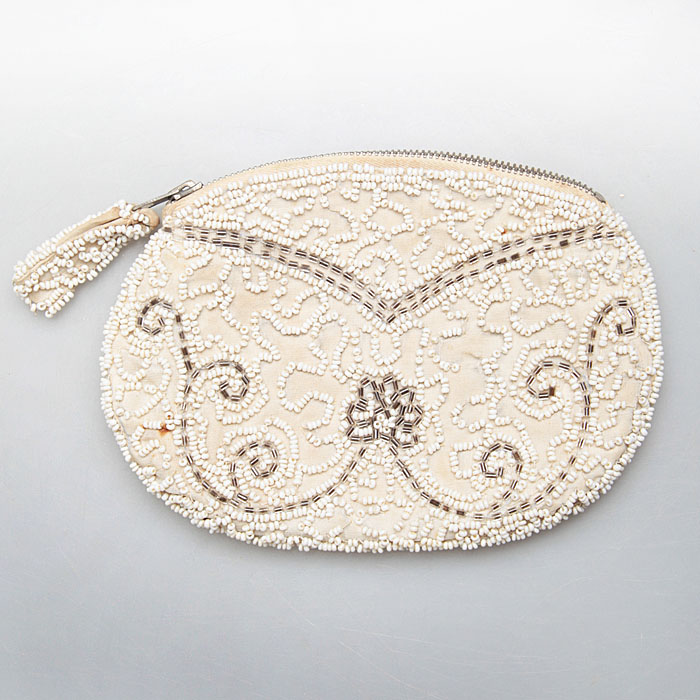 Роскошный старинный дамский кошелек ручной работы, украшенный белым и серебристым биссером.