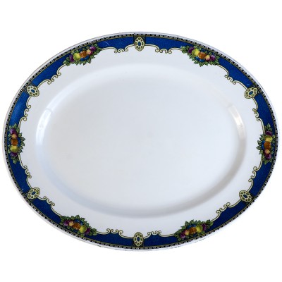 Большое овальное блюдо с ярким синим фруктовым орнаментом.