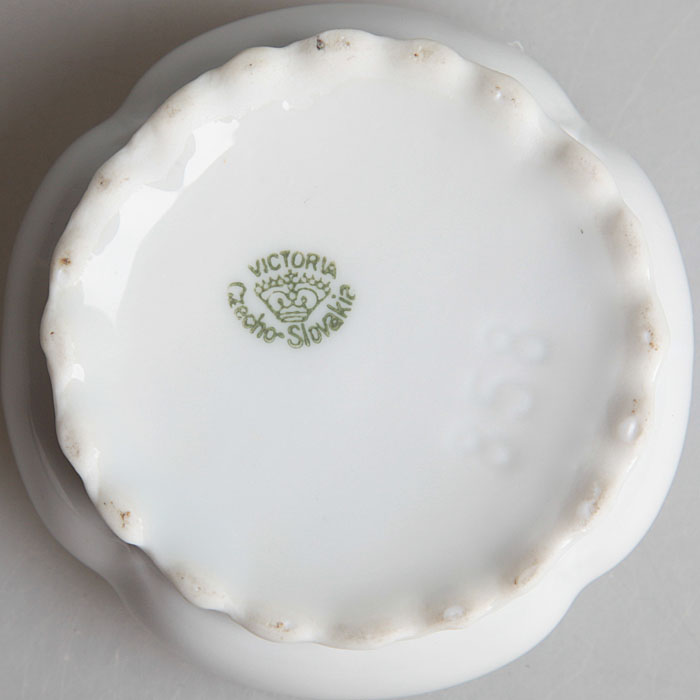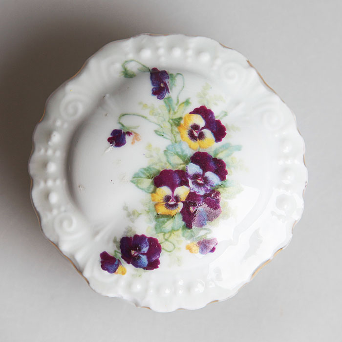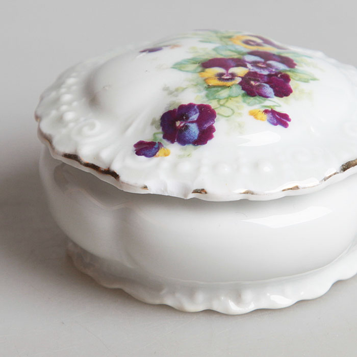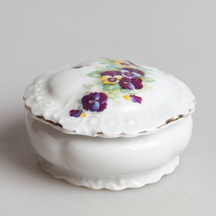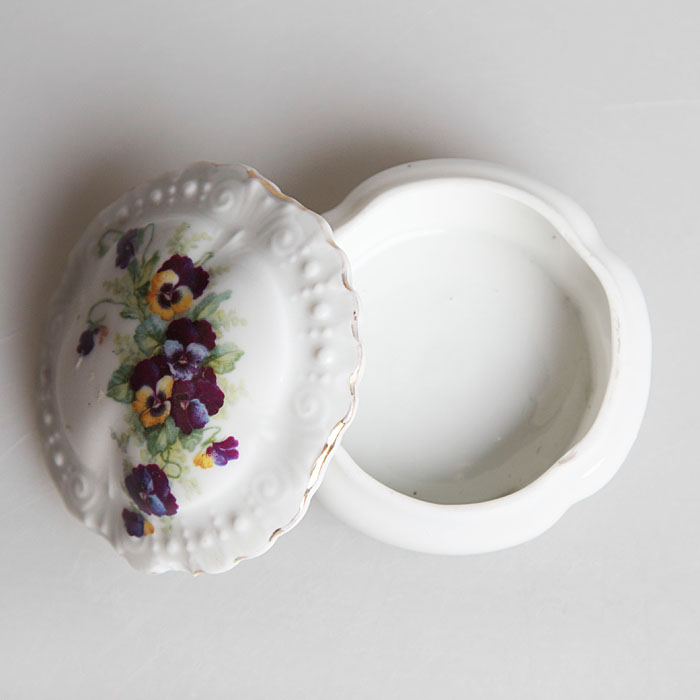 Шкатулка круглая "Анютины глазки". Форфор, деколь, золочение. Victoria, Чехословакия, середина ХХ века