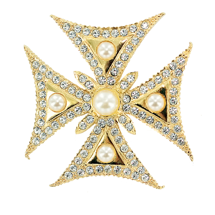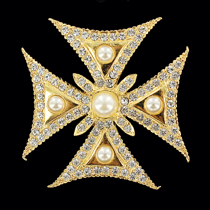 Брошь " Мальтийский крест" от Sphinx, искусственный жемчуг, стразы, бижутерный сплав золотого тона. Великобритания, 1990-е годы