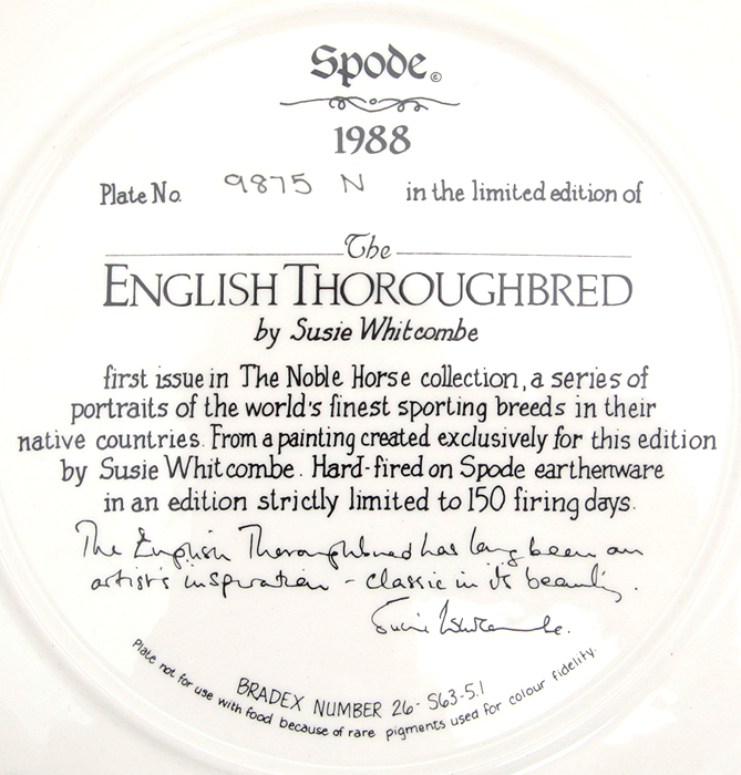 Сюзи Вайткомб "Английская чистокровная ", декоративная тарелка. Фарфор, деколь с подрисовкой. Spode, Великобритания, 1988 год