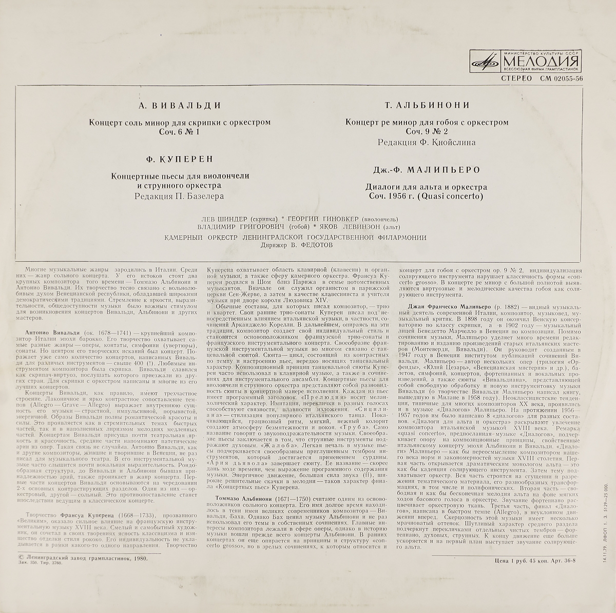 Автор: Вивальди, Куперен, Альбинони, Малипьеро - Камерный оркестр Ленинградской филармонии - В. Федеров дирижер.