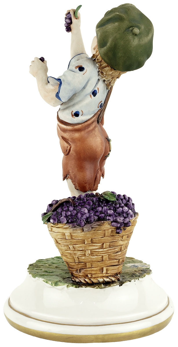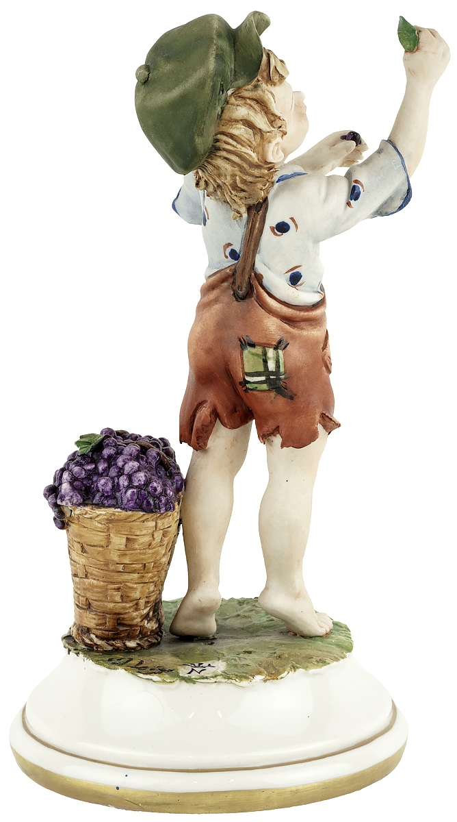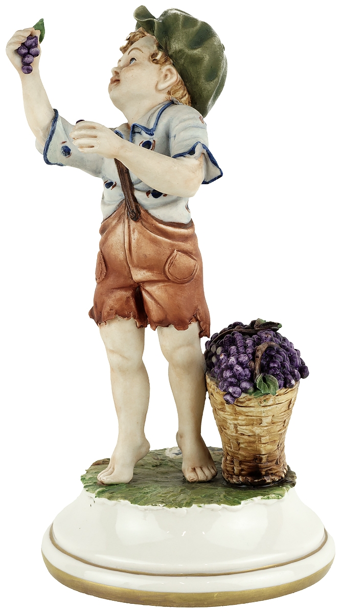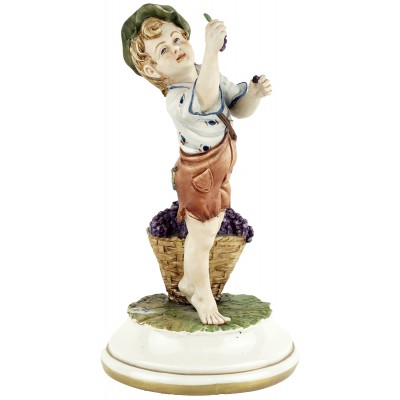 Великолепная жанровая статуэтка "Мальчик с виноградом" знаменитой неаполитанской фабрики фарфора Capodimonte. Этот коллекционный фарфор, отличает точайшая проработка мелких деталей и повышенное внимание авторов к жесту, позе и выражению лица персонажей.