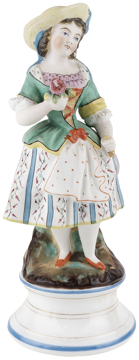 Сохранность хорошая, трещина (разрыв массы) на ручке серпа в руке у дамы (скорее всего трещина при обжиге), маленький скол на шляпе сзади у дамы, в остальном без повреждений.