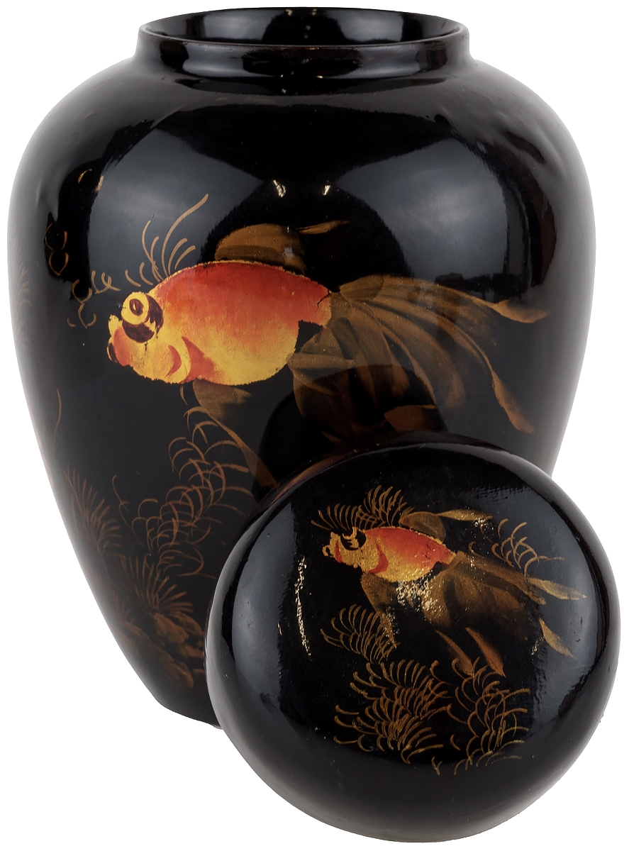 Чайница "Золотые рыбки, банка для чая, дерево, черный лак, винтаж, Вьетнам, вторая половина 20 века (с нюансом)