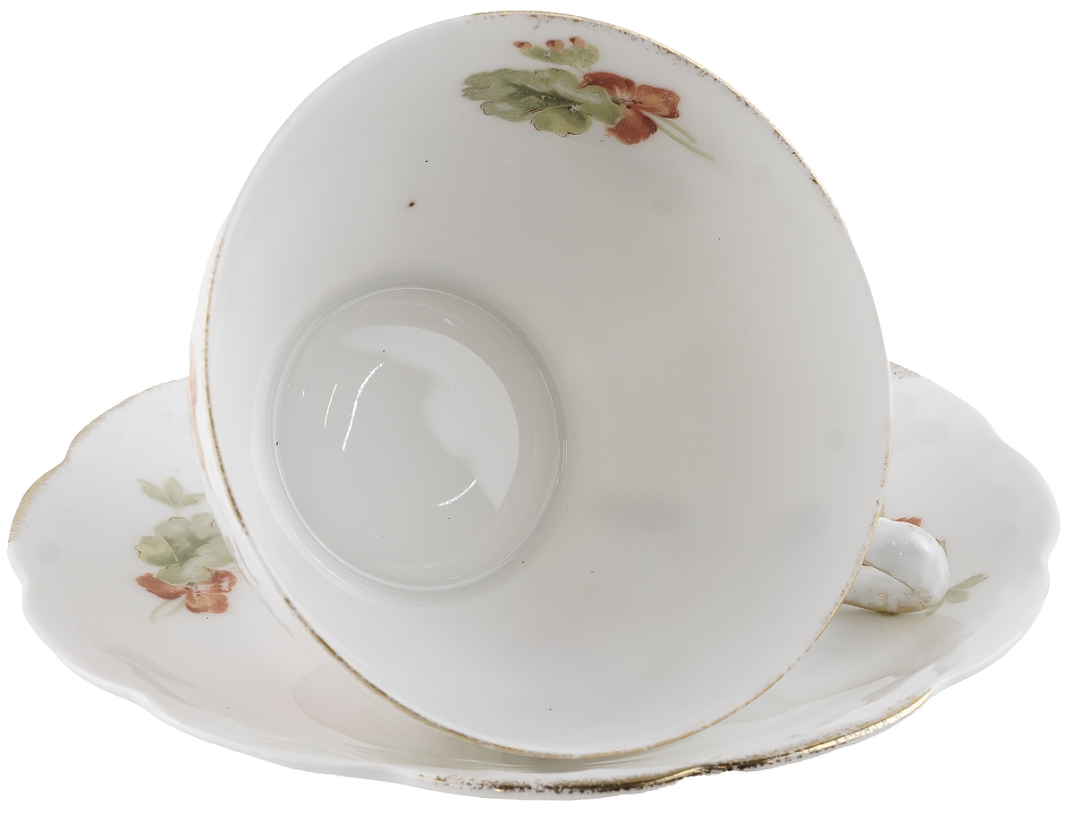 Сохранность хорошая, без сколов и трещин. На предметах могут быть небольшие мушки (темные точки). Потертость золочения в соответствии с возрастом. Рисунок внутри чашки и на блюдце может незначительно отличаться от приведенного на фото.