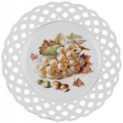 Декоративная тарелка антикварная "Виноград и фундук". Ажурный прорезной фарфор Schumann Bavaria. Германия, 1932-1944 гг.