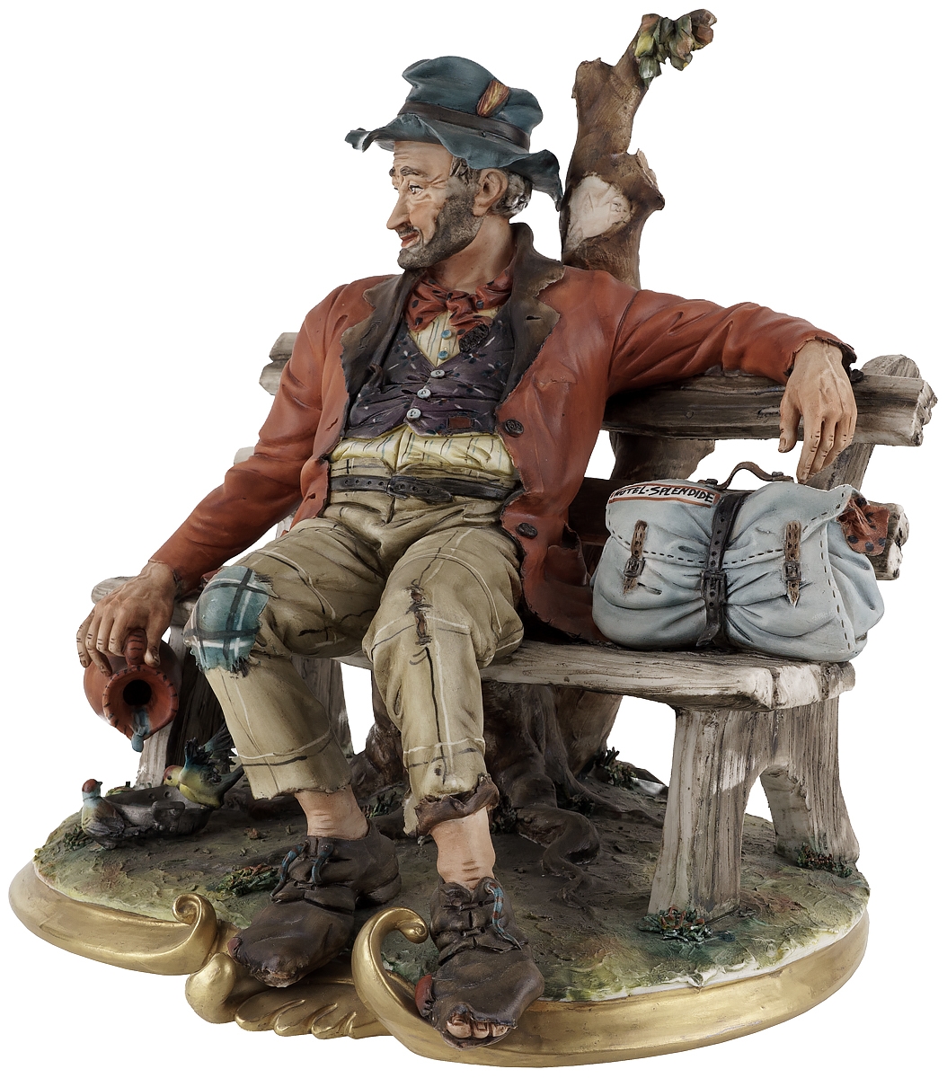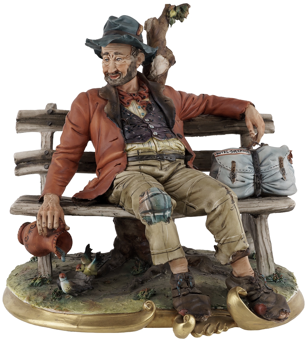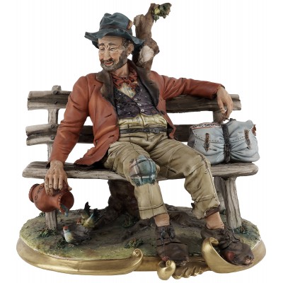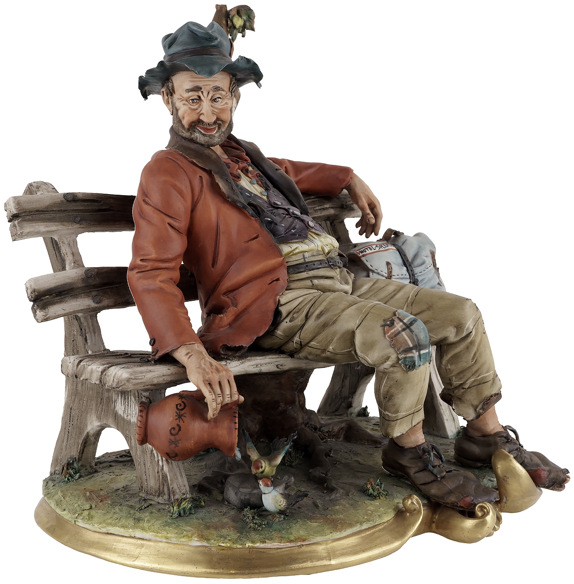 Великолепная жанровая статуэтка "Бродяга поит птичек" знаменитой неаполитанской фабрики фарфора Capodimonte! Этот коллекционный фарфор, отличает тончайшая проработка мелких деталей и повышенное внимание авторов к жесту, позе и выражению лица персонажей.