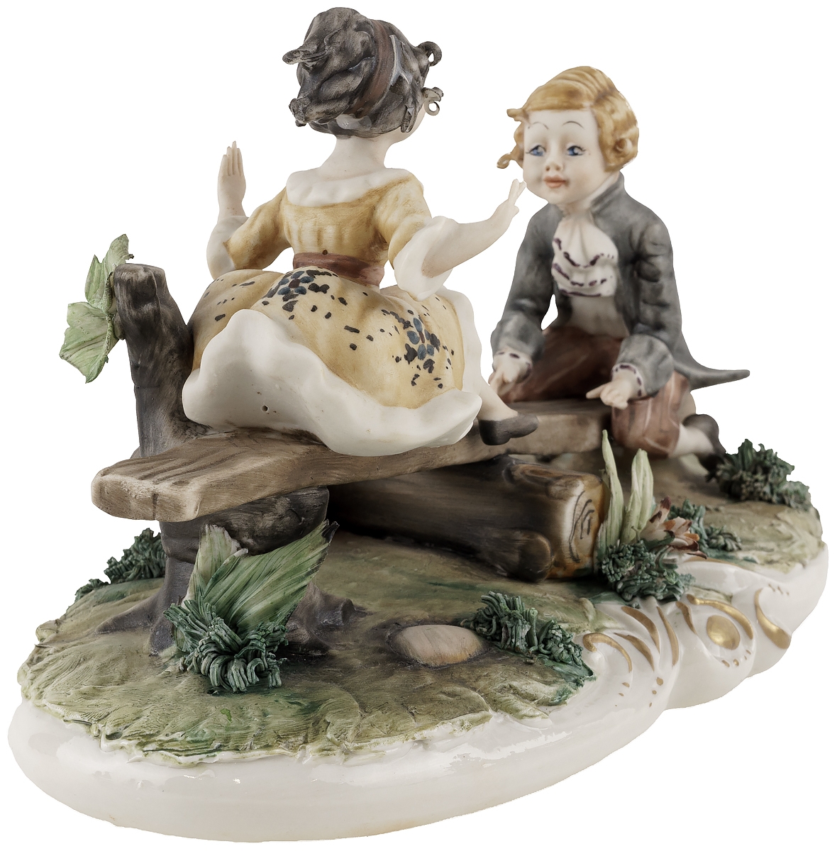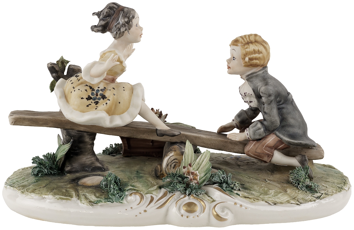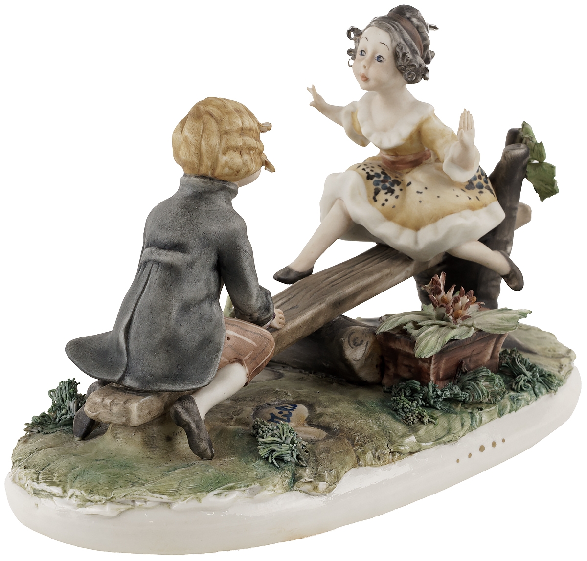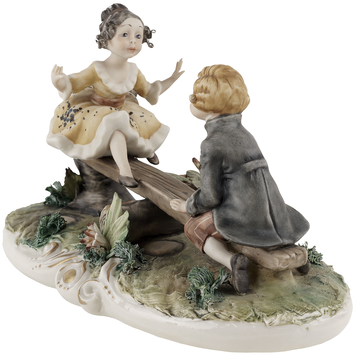 Великолепная жанровая статуэтка "Дети на качелях" знаменитой неаполитанской фабрики фарфора Capodimonte! Этот коллекционный фарфор, отличает тончайшая проработка мелких деталей и повышенное внимание авторов к жесту, позе и выражению лица персонажей.