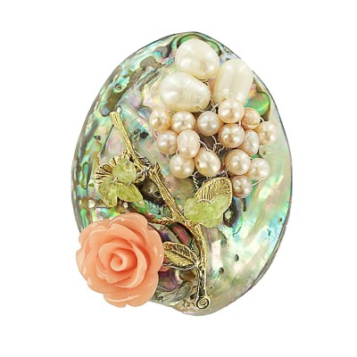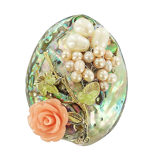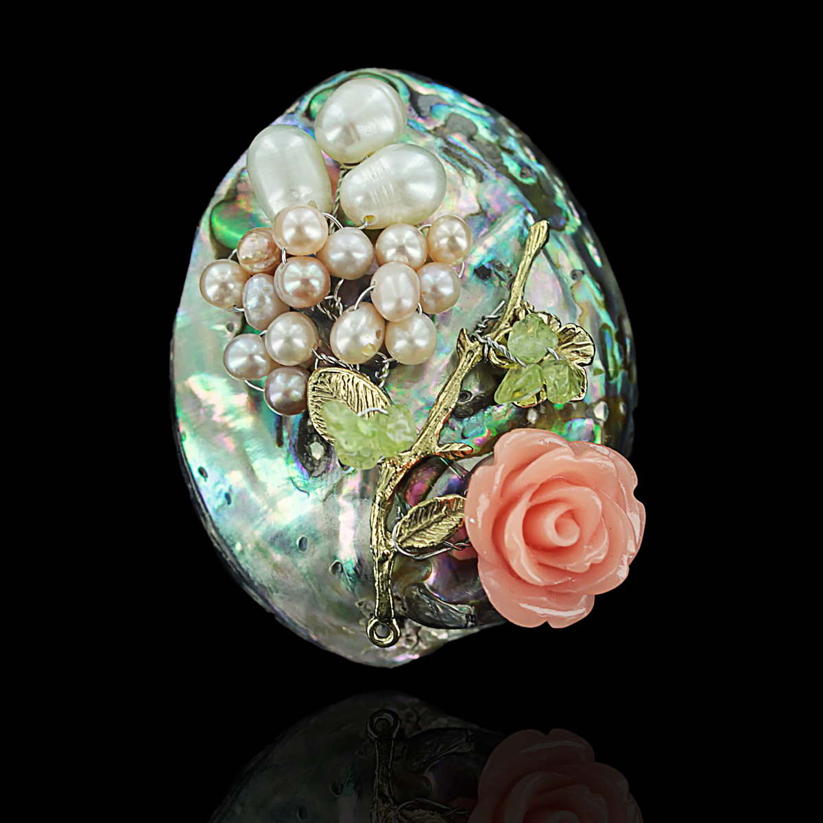 Брошь-кулон "Роза и жемчуг" от Arrina. Натуральная ракушка, перламутр, лак, смола, искусственный жемчуг, бижутерный сплав золотого тона, ручная работа. Гонконг, 2010