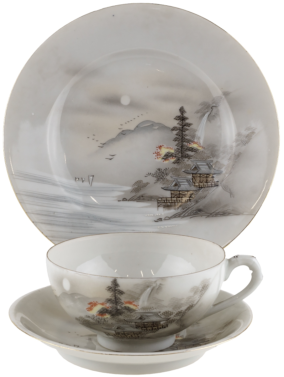 Чайное трио винтажное "Дом у озера", Фарфор Kutani, Япония, середина 20 века