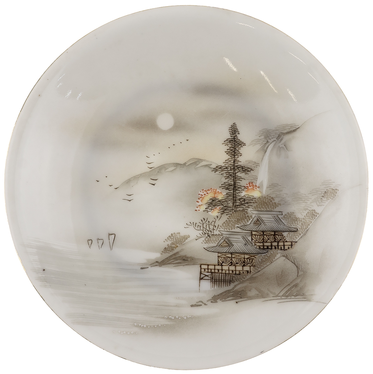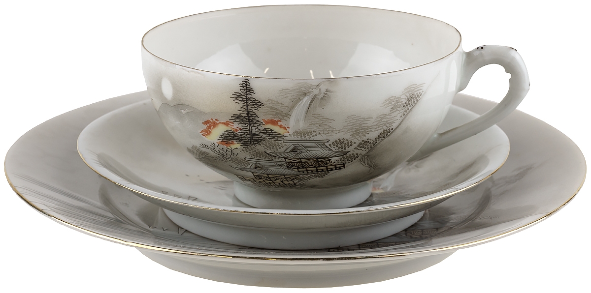 Чайное трио винтажное "Дом у озера", Фарфор Kutani, Япония, середина 20 века (нюанс)
