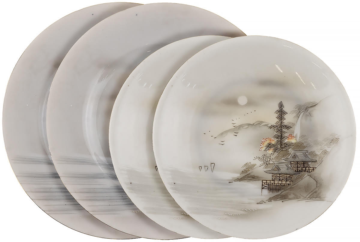 Набор десертных тарелок и блюдец "Дом у озера", 4 предмета, Фарфор, ручная роспись, Kutani, Япония, винтаж, середина 20 века