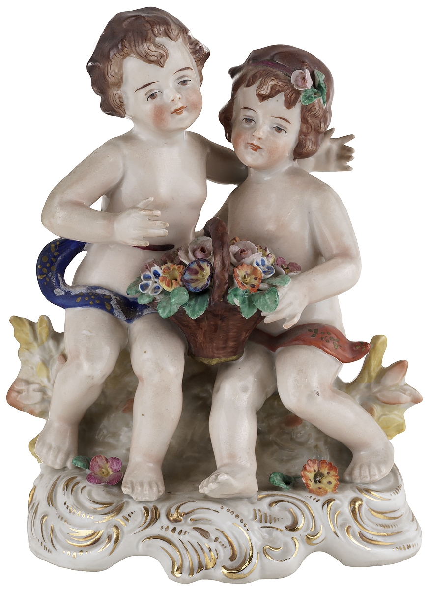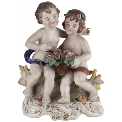 Статуэтка антикварная "Мальчики с корзиной цветов", Фарфор Samson, Франция?, Высота 17 см, вторая половина 19 века