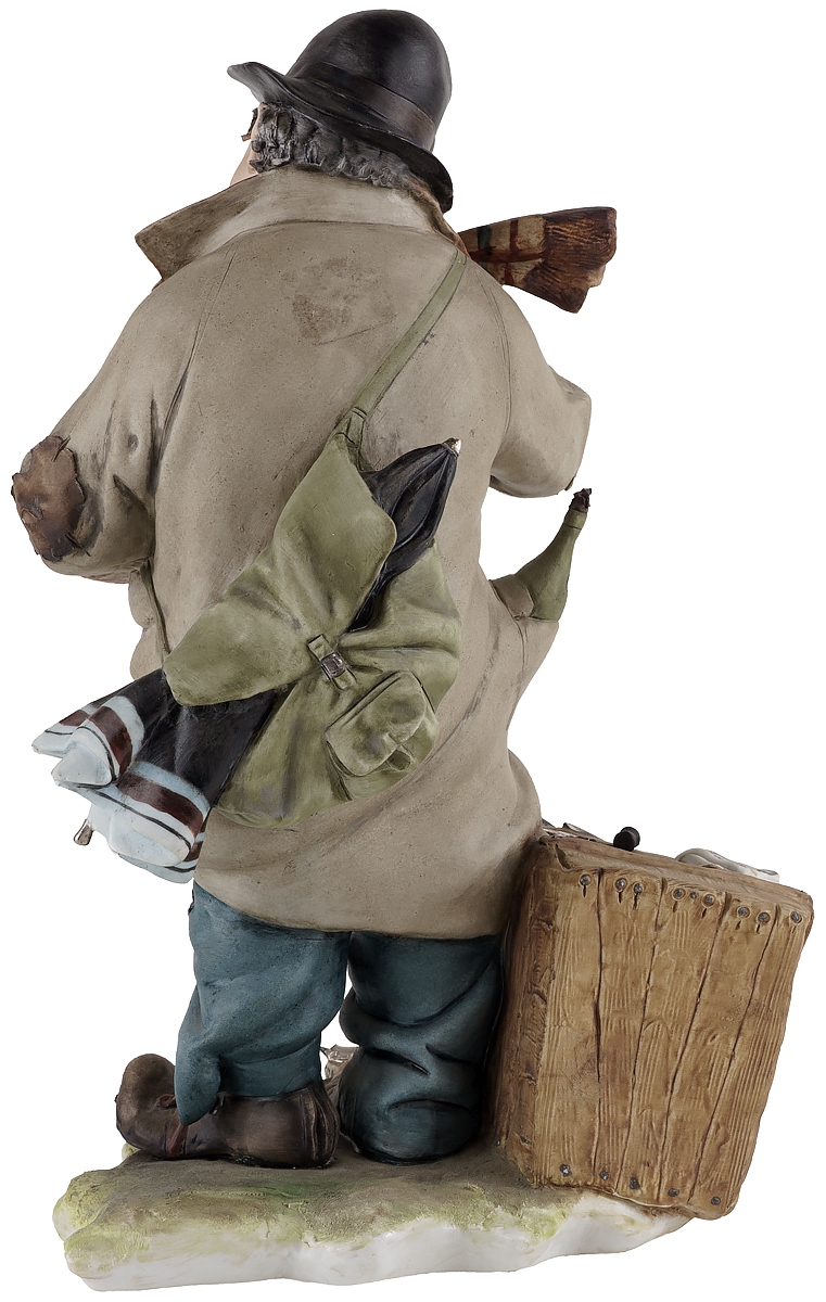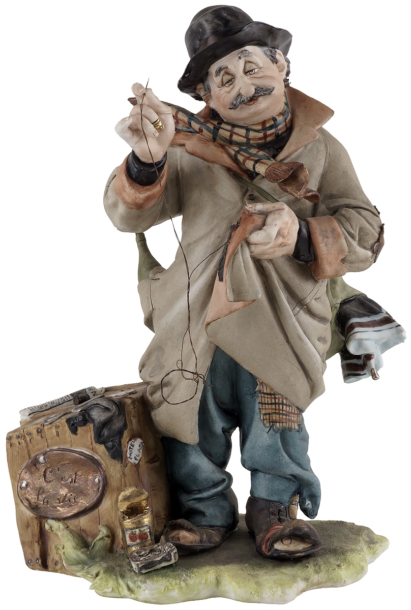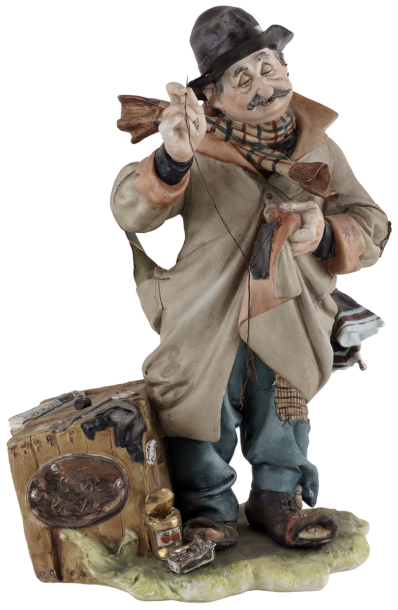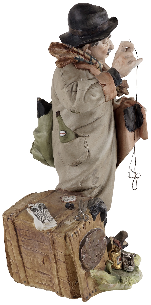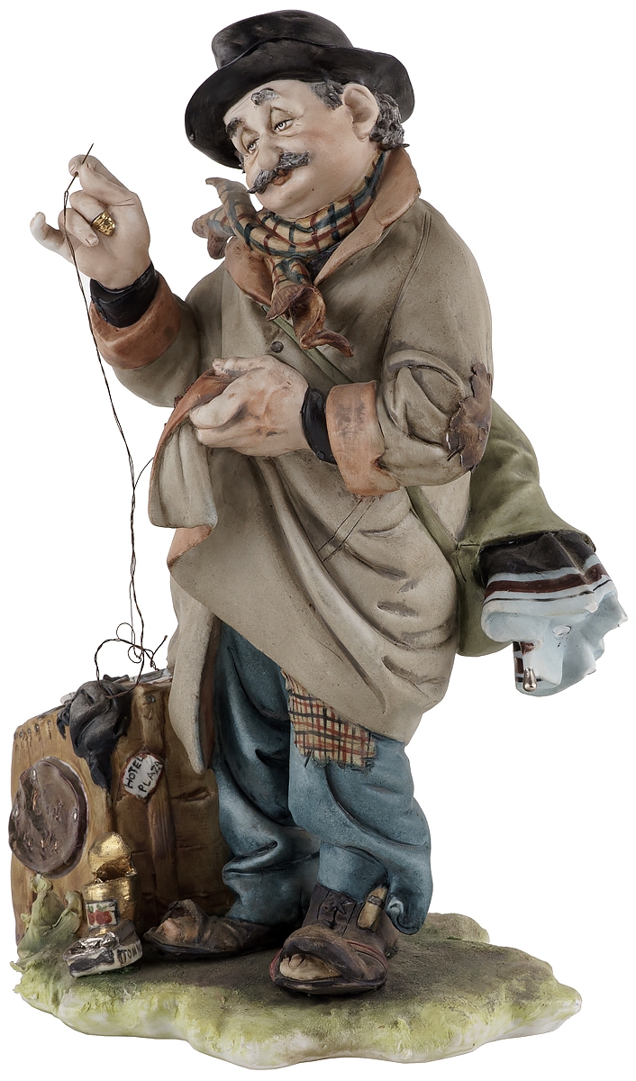 Великолепная жанровая статуэтка "Бродяга штопает пальто" знаменитой неаполитанской фабрики фарфора Capodimonte. Этот коллекционный фарфор, отличает тончайшая проработка мелких деталей и повышенное внимание авторов к жесту, позе и выражению лица персонажей.