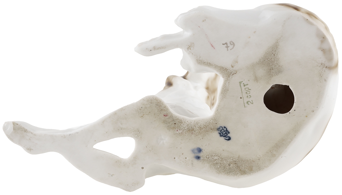 Сохранность хорошая, без трещин. На теле несколько маленьких коричневых точек - производственные дефекты обжига, незаметный скол снизу на передней лапе.