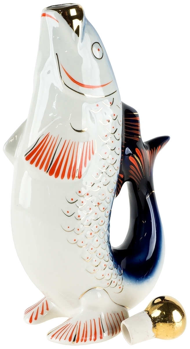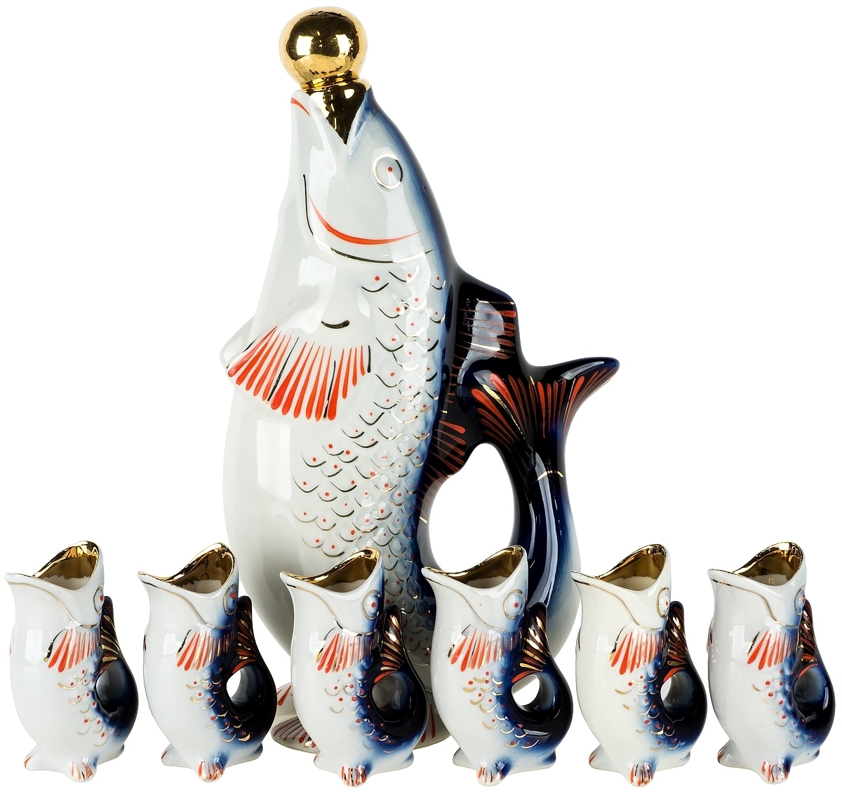 Графин - штоф и 6 стопок "Рыбы", для водки синий, Фарфор, СССР, Полонное ЗХК, вторая половина 20 века