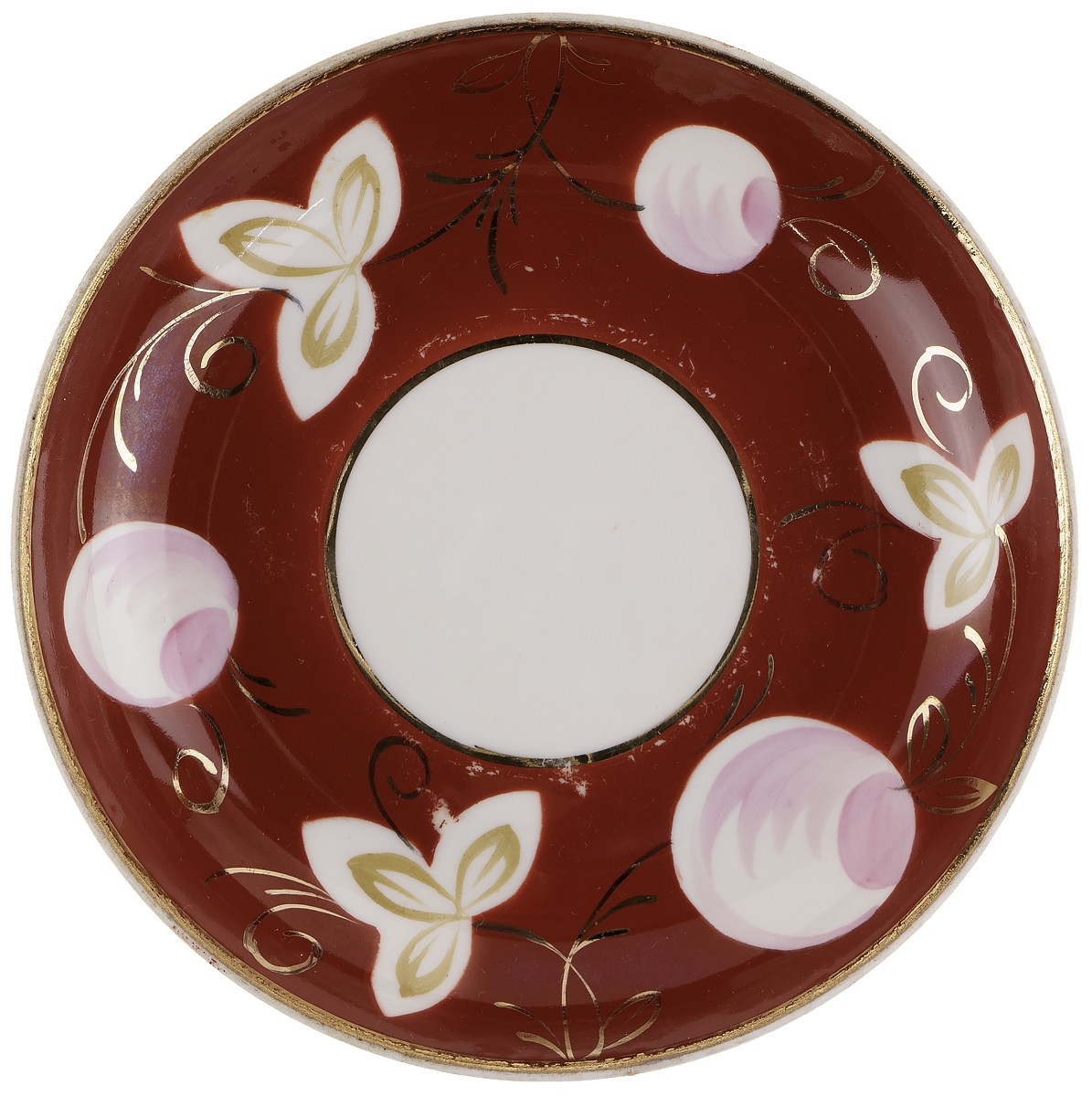 Сохранность хорошая, без сколов и трещин. Потертость красочного слоя на блюдце, незначительная потертость золочения в соответствии с возрастом.