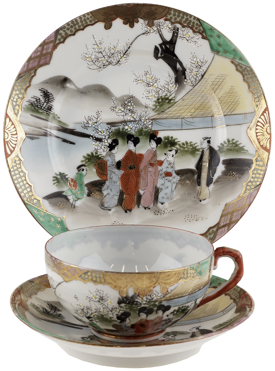 Чайное трио "Три гейши на прогулке". Фарфор, ручная роспись. Япония, винтаж, середина 20 века