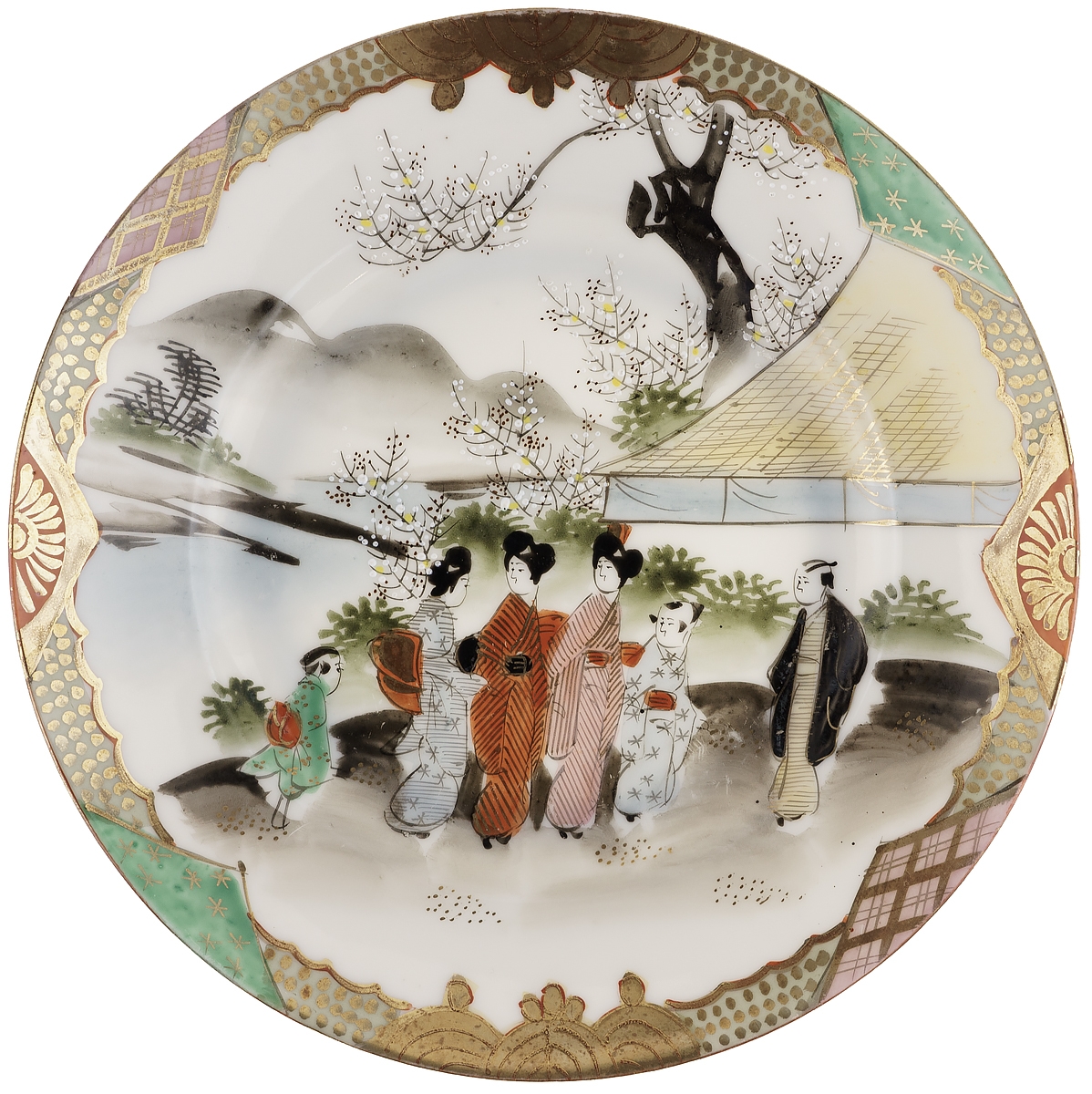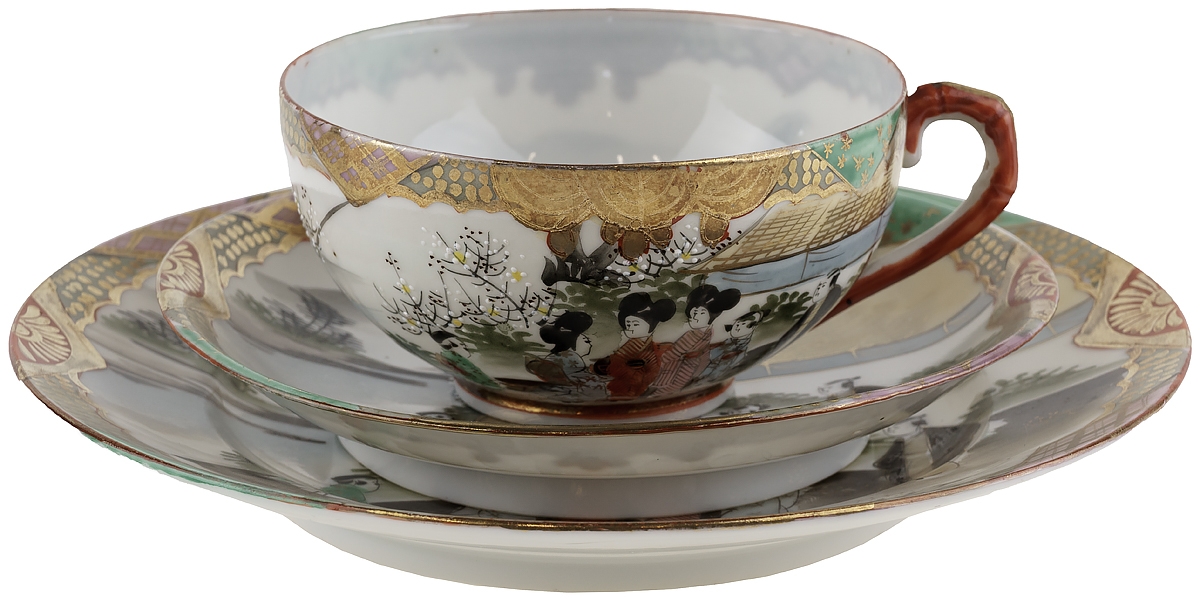Чайное трио "Три гейши на прогулке". Фарфор, ручная роспись. Япония, винтаж, середина 20 века (нюанс)
