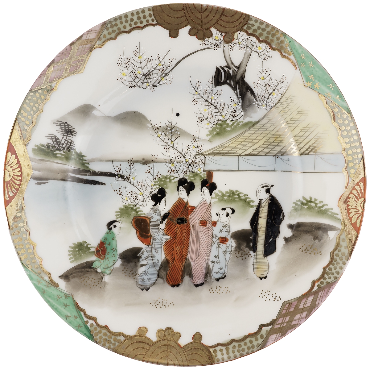 Тарелка - блюдо для сервировки чайного стола "Три гейши на прогулке". Фарфор, ручная роспись. Япония, винтаж, середина 20 века