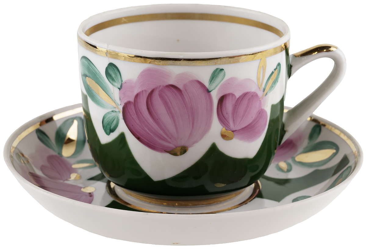 Чайная пара "Цветы на зеленом", Фарфор, винтаж, Вербилки, СССР, 1965-1991 гг.(с повреждением)