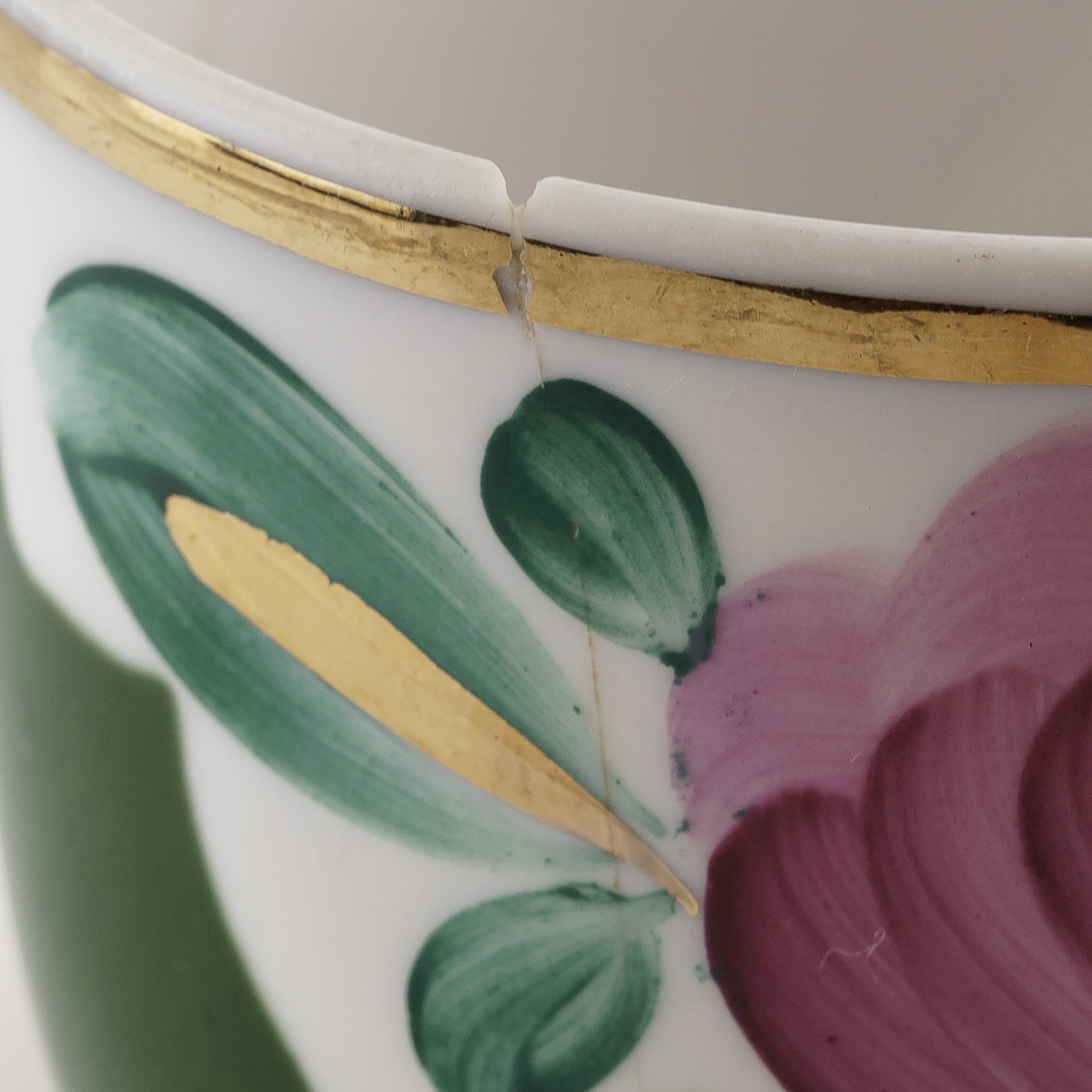 Сохранность удовлетворительна. Скол и трещина на чашке, чашка не звенит.